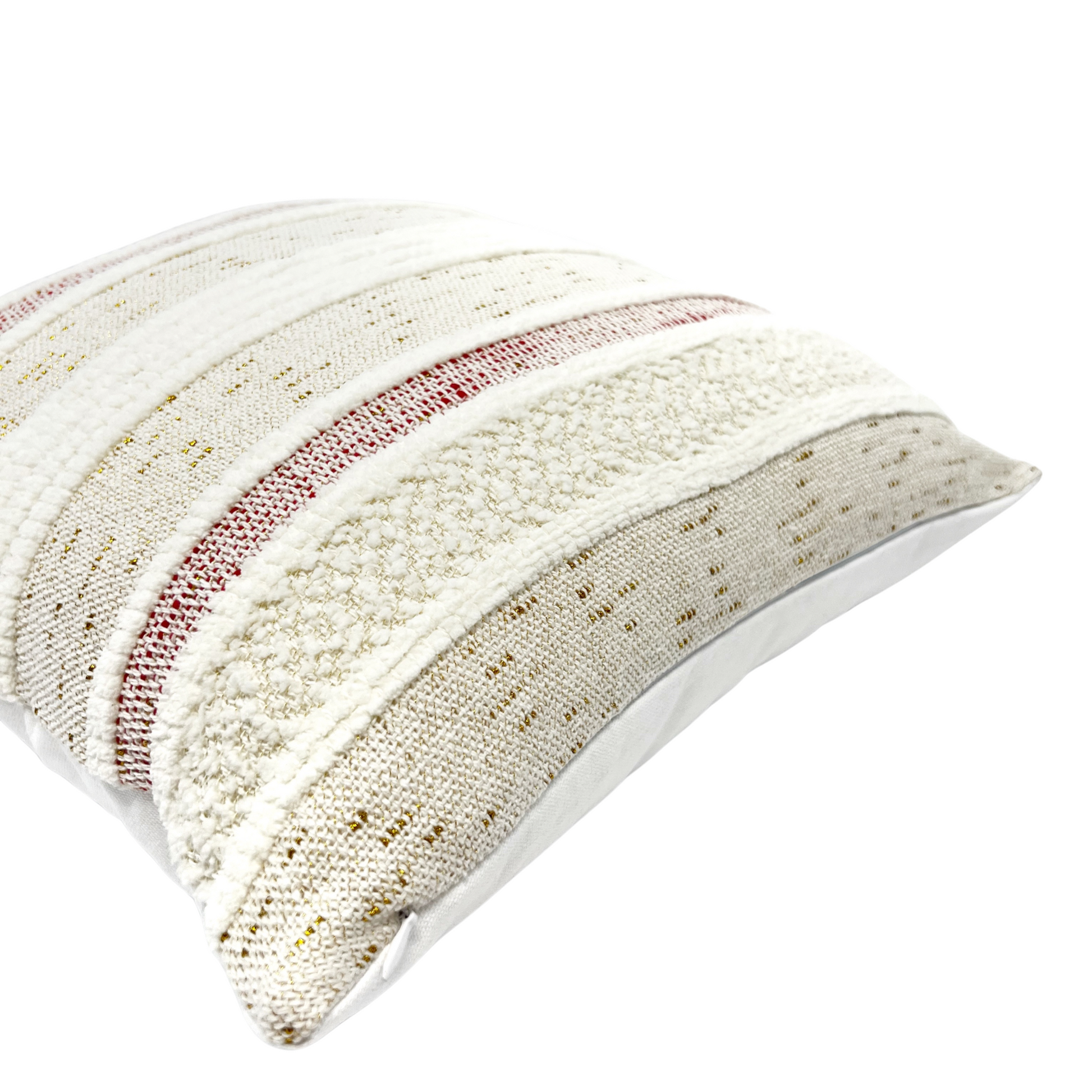 This beautiful cover features a soft, woven texture in a varied striped pattern in shades of cream and red with gold flecks throughout.