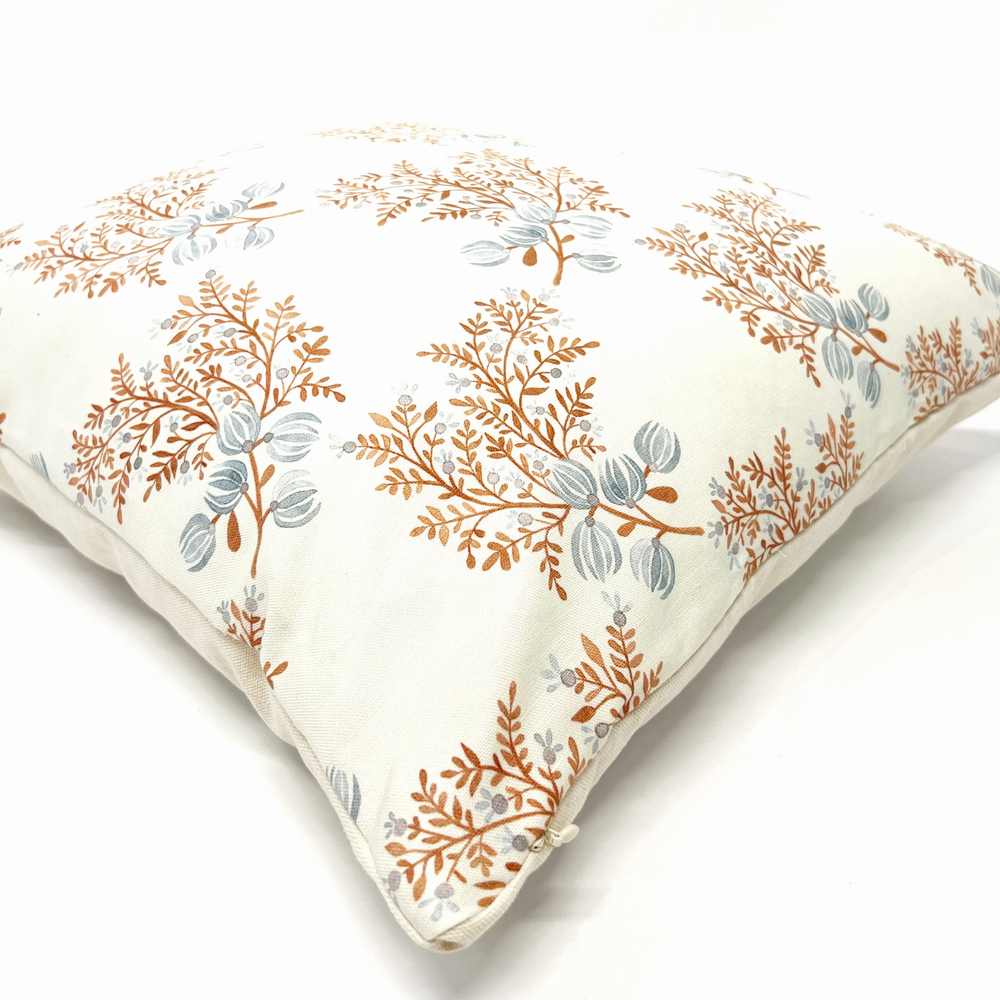 This delicate floral pillow cover is the perfect mix of neutral and color. It cover features a cream-colored background paired with dusty blue and terra cotta florals on a linen/cotton blend fabric.